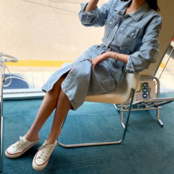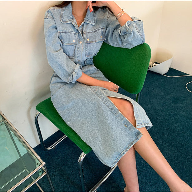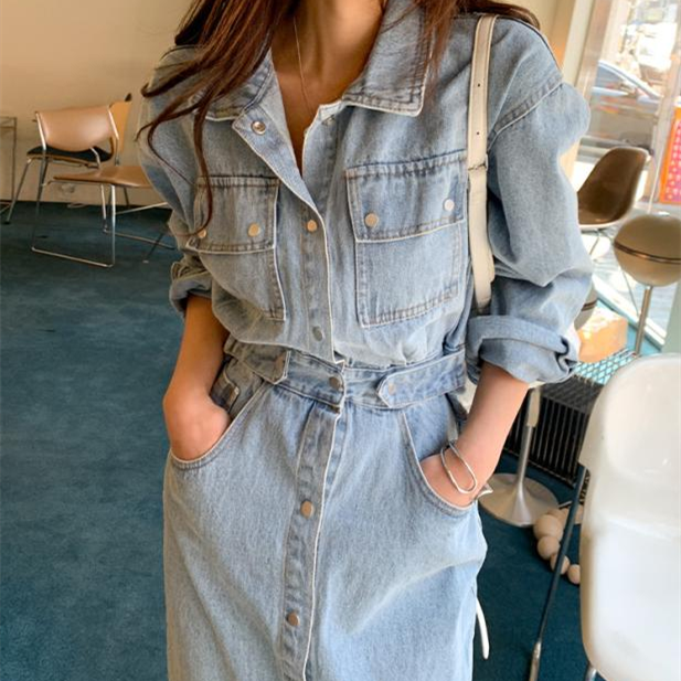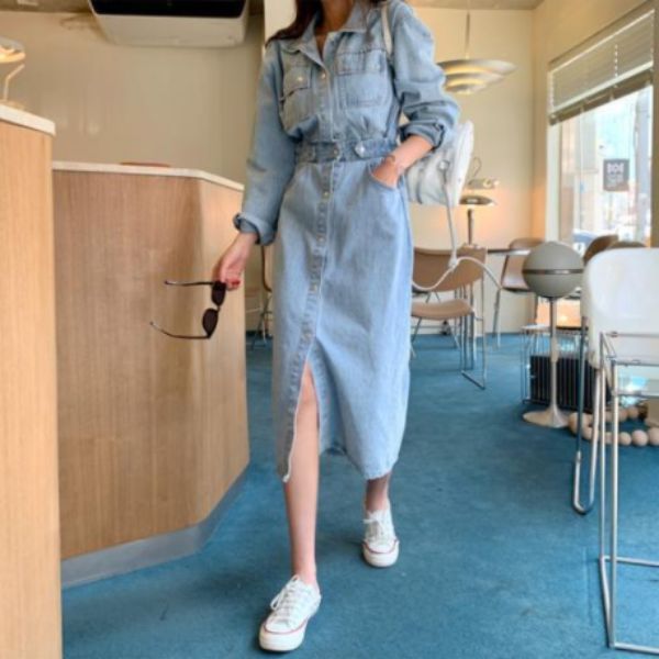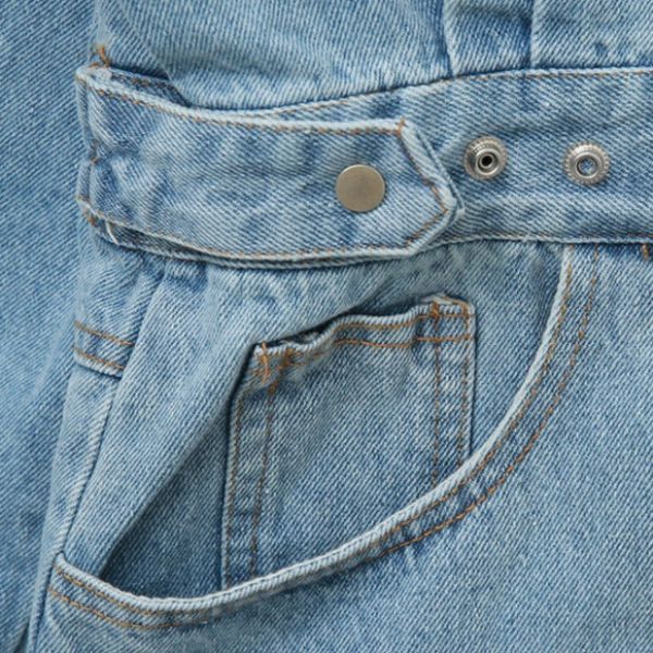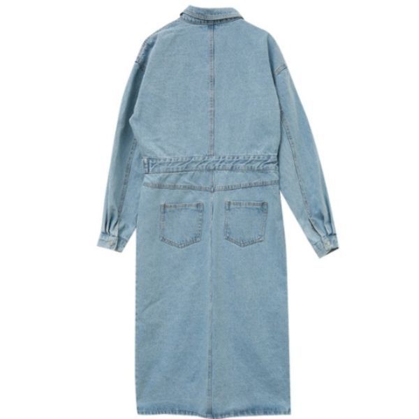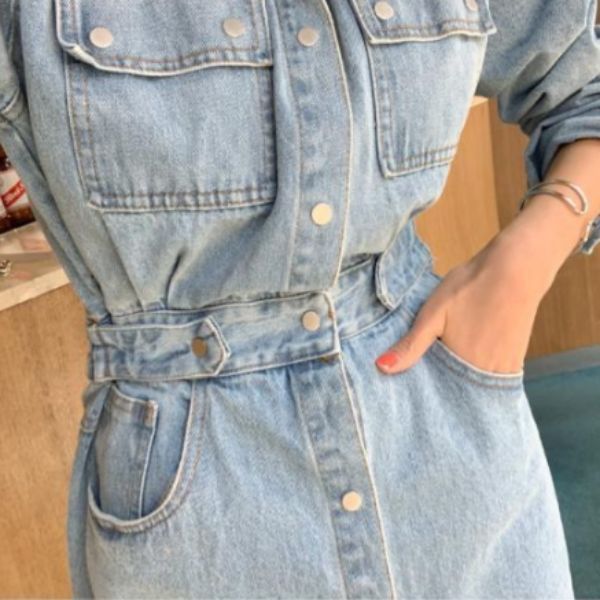 デニムワンピース サイドベルト ポケット オールインワン フロントボタン カジュアル
