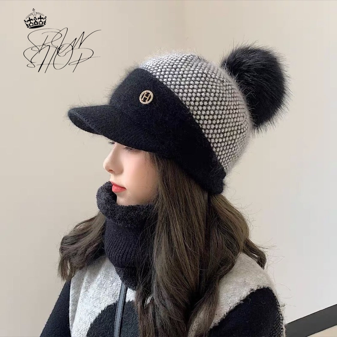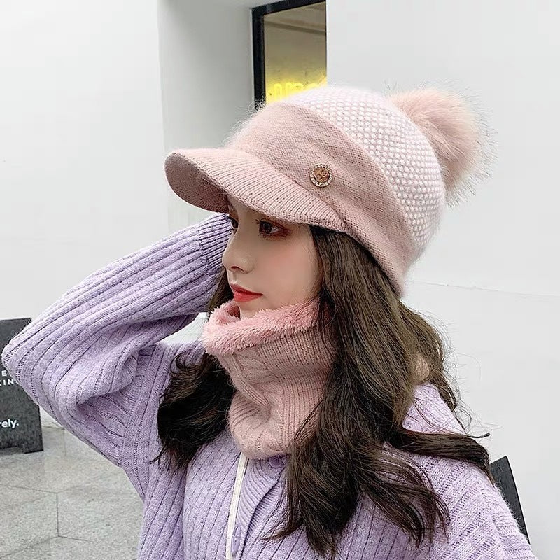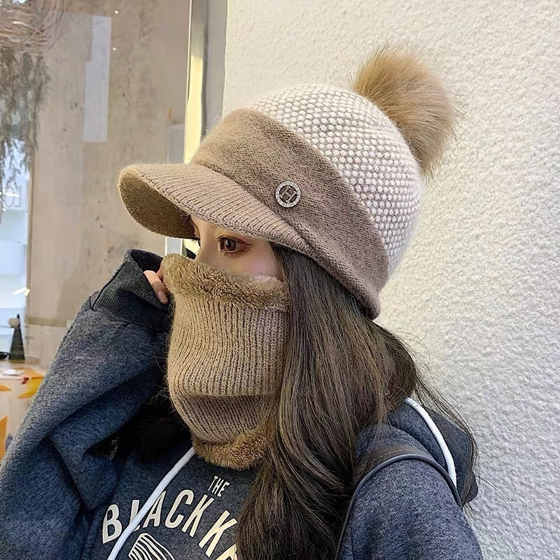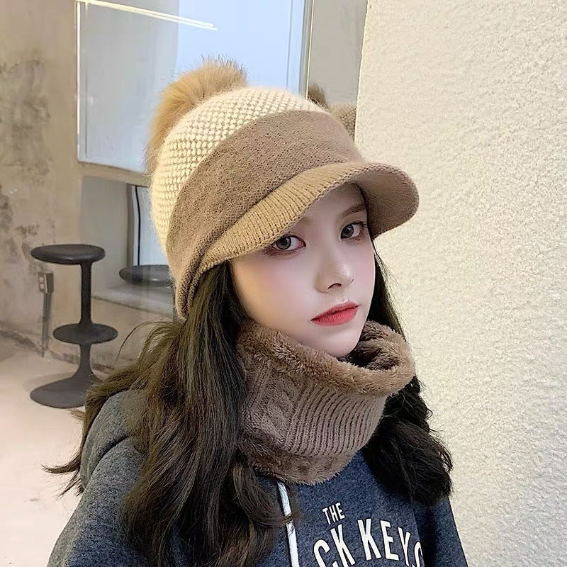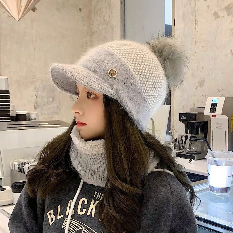 ポンポンがとてもキュートなバイカラーのツバ付きニット帽。