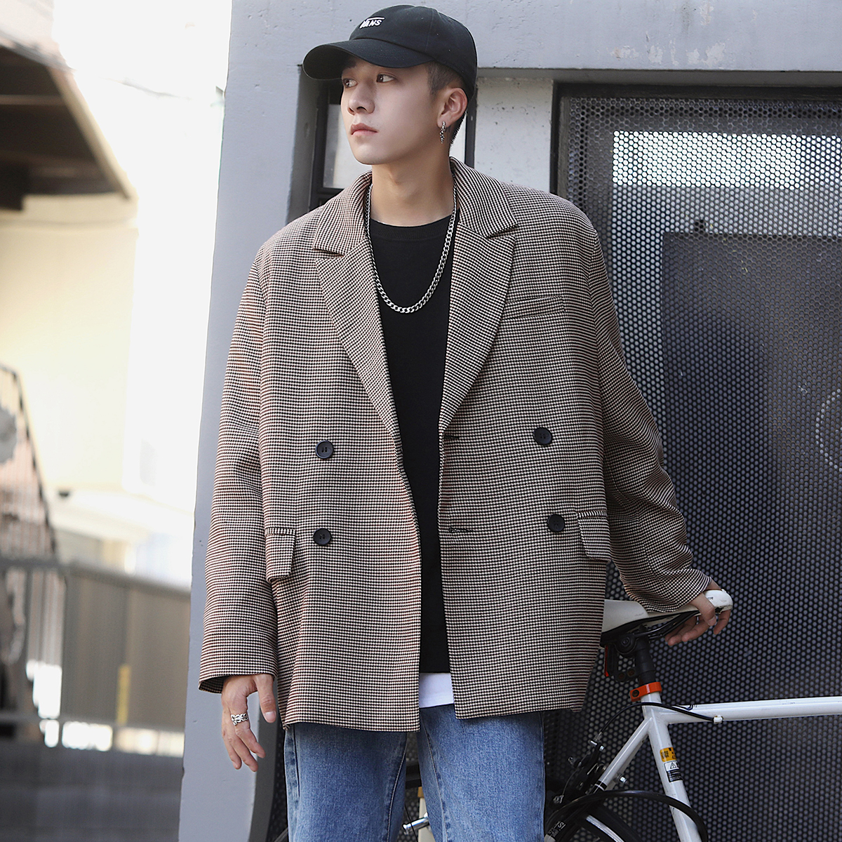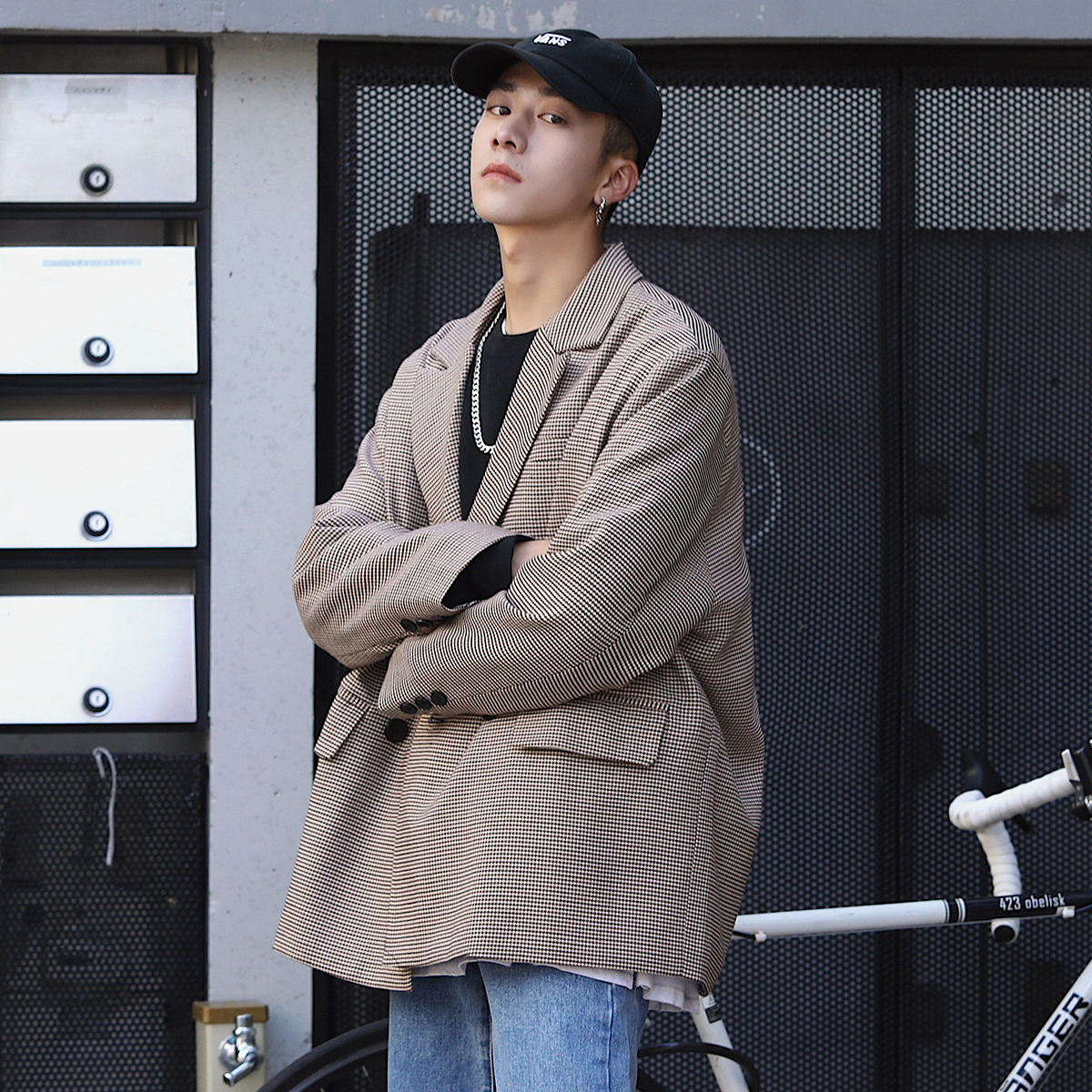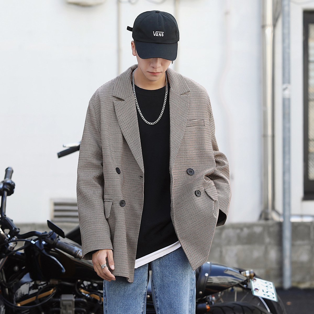20%OFF メンズ テーラードジャケット ダブル チェック オーバーサイズ 韓国 ストリート 秋冬